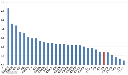 图表2:(申万)板块整体ROE(2018Q1)情况,券商板块排名靠后