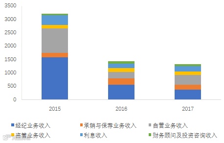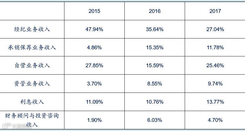 经纪业务占比下降,自营与资管业务崛起。从收入结构看,二级市场成交量走低和佣金率持续下降导致经纪业务收入占比逐年下滑,由15年占总收入将近一半的比例下降到16年的三分之一再到今年上半年的接近四分之一;承销与保荐业务收入占比同样下滑,主因债券融资规模大幅下滑;券商主动管理能力增强,自营业务与资管业务崛起,收入合计占比由上年同期的24%上升至35%。