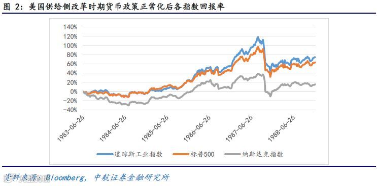 80年代初美国遭遇严重的通胀,货币政策大为收紧,1981至1982年联邦基金利率曾经高达20%以上。美国这一时期的货币政策与我国当下的货币政策不具备可比性,因此我们统计83年以后通胀缓和,货币政策正常化之后各指数的累计收益率。1983年至1989年代表蓝筹的道琼斯工业指数持续跑赢代表成长的纳斯达克指数。