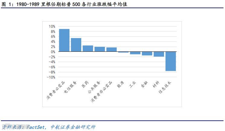 回顾美国供给侧改革的历史,经济结构发生变化时高成长预期、高市盈率标的估值遭受巨大压力,蓝筹、传统行业受益明显。从美国标普500指数分行业涨跌幅的期间内平均值可以看出,以刚性需求为主的传统行业,包括消费者必需品、电信、医药及公共服务等,在期间内的平均涨幅处于领先态势,而以信息技术为代表的高成长、高估值产业则明显表现不佳。