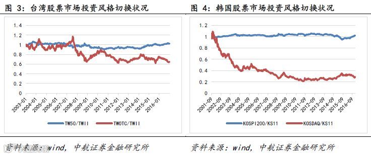 为了观察自国际化初见成效以来两地股票市场投资风格的切换,我们统计了代表台湾大盘蓝筹股的TW50指数与台湾中小板市场指数TWOTC相对于台湾加权指数(TWII)的比例,以及代表韩国大盘蓝筹股的KOSPI200指数与韩国创业板市场指数KOSDAQ相对于韩国综合指数(KS11)的比例。台湾与韩国两地的中小创指数自本世纪初至今均跑输大盘,而大盘蓝筹基本上在持续引领市场行情。该趋势在韩国表现得尤为明显。