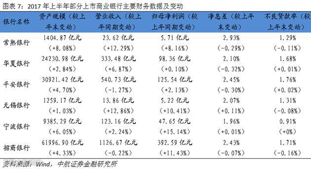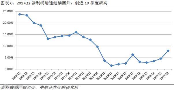 净利润增速方面,2016Q2以来,商业银行净利润增速开始企稳回升,进入2017年,在经济增速回暖的背景下,商业银行净利润增速回升势头愈发明显,近3个季度,累计净利润同比增幅不断扩大,从2016Q3的2.82%上升到2017Q2的7.92%。