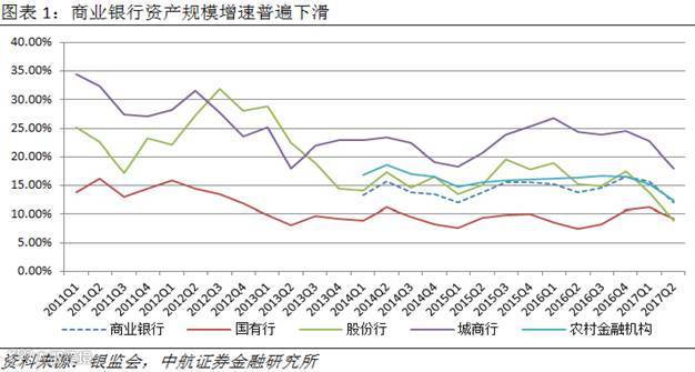 资产规模增速方面,分机构看,国有行、股份行、城商行、农村金融机构资产规模增速普遍下滑,其中股份行和城商行下滑较为明显,这主要受上半年银监会监管政策的影响,中小银行依靠做大同业业务规模实现快速扩张的态势遭到了遏制。