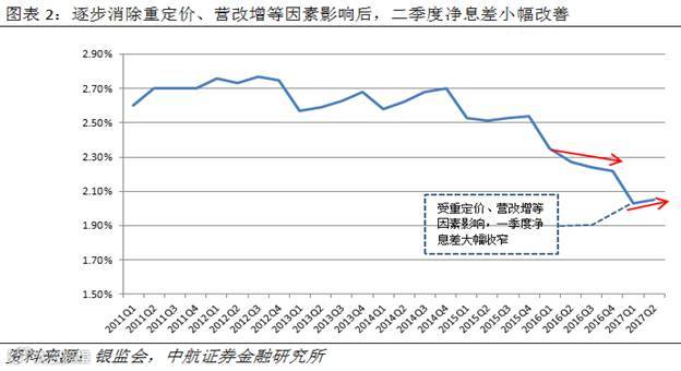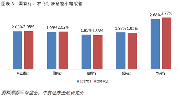 净息差方面,2017Q1受贷款重定价、营改增等因素影响,净息差并未延续去年二季度以来缓慢收窄的态势,较去年末大幅下降19BP至2.03%。今年二季度,随着负债端成本上升的压力向资产端逐步传导,加之营改增价税分离因素的退出,净息差较一季度小幅改善2BP至2.05%。分机构看,商业银行整体净息差的改善主要受益于国有银行和农商行,其中国有行净息差上升3BP至2.02%,农商行净息差上升9BP至2.77%。