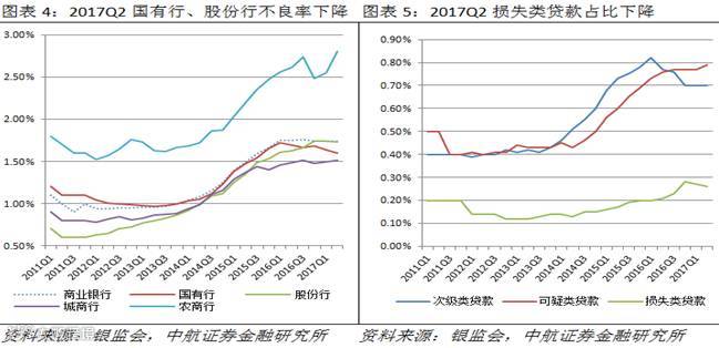 不良贷款率方面,分机构看,国有行和股份行不良率均有所下降,分别下降4BP和1BP至1.60%和1.73%,国有行不良贷款余额较一季度环比下降26亿元,率先实现了不良的双降。从不良贷款结构来看,2017Q2同Q1相比,次级类贷款率保持不变,为0.70%,可疑类贷款率上升2BP至0.79%,损失类贷款率下降1BP至0.26%。