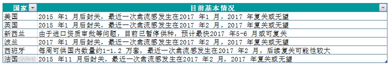 我们对于研究疫情应该谨言慎行,我们整理了我国禽流感的疫情现状,可以看出我们仍不能对禽流感掉以轻心。从禽链投资的角度看,世界性的禽流感将对我国祖代鸡引种产生较大的影响。我国禽链的祖代鸡长期依赖进口以前多来自美国和法国,随着这两个国家因为禽流感被封关。我国主要引种原由西班牙、荷兰等替代。我国祖代鸡引种量15年为70万套16年为64万套,根据世卫组织最新报道西班牙加泰罗尼亚地区发生H5N8高致病性禽流感疫情。发病肉鸭723只,死亡723只,销毁17077只。作为目前我国的核心祖代鸡供应国,西班牙禽流感疫情的爆发将会使我国祖代鸡供应进一步减少。预计17年全年祖代鸡引种量将降为40万套左右。