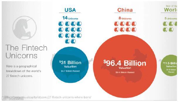 中国金融科技后来居上。2016年麦肯锡、花旗等多家机构曾发布统计数据,指出中国Fintech(金融科技)市场开始接替日渐萎缩的欧美市场,成为全球金融科技投资人最关注的地区。其中花旗估计,2016年中国金融科技风投资金同比增长至少100%,而美国与欧洲则分别下滑约 38% 与 27%。另外据统计,在全球 27 家金融科技“独角兽”公司里,中国占了8 家,这8家公司从成立以来总计募集了 94亿美元资金,总体估值超过 964亿美元。