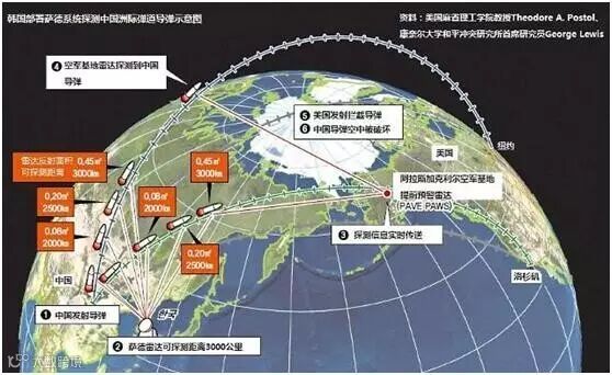 图3:韩国部署萨德系统探测中国洲际弹道导弹示意图