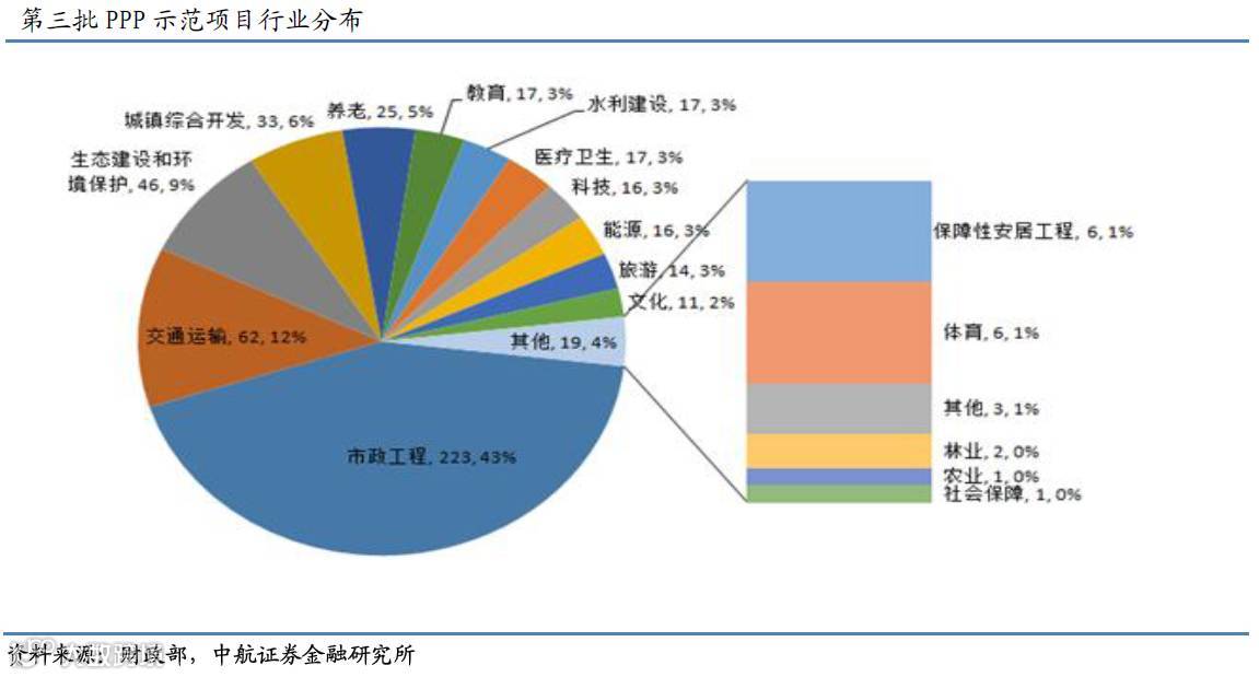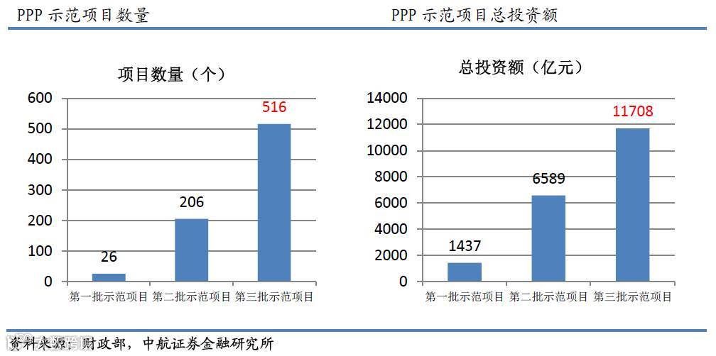 10月13日多部门联合公布第三批PPP示范项目。此次公布的项目数量为516个,计划总投资金额为11,708亿元。财政部2014年公布第一批PPP示范项目26个,总投资额1437亿元,2015年公布第二批示范项目206个,总投资金额6589亿元。前两批共计232个,总投资额8,026亿元,第三批示范项目不论数量还是总投资额都大幅增加。相较于第二批示范项目,项目数量翻番,投资额增加逾八成。这主要得益于随着PPP模式推广的深入,申报条件更加清晰、评审流程更加规范。地方政府申报项目的设计方案也日趋成熟,申报热情空前高涨。鉴于前两批示范项目的落地率的优异表现(6月末公布的数据为48.4%),我们预计到2017年底第三批示范项目将有40%以上的项目进入到执行阶段,总投资额将超过5000亿元。