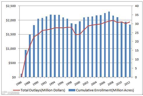 图2:美国每个财年CRP项目支出及实施CRP的累积面积