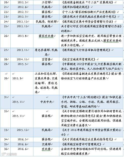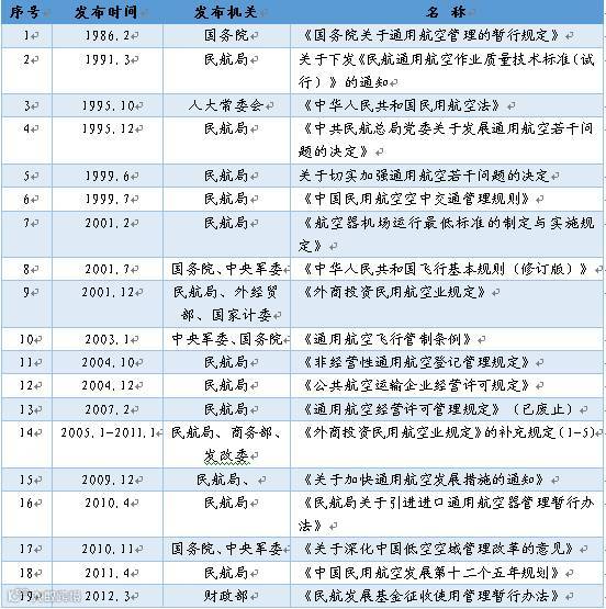 随着通航产业的市场需求进一步的释放,与之相关的政策法规也相继出台,特别是近几年来,来自中央及国家层面的支持通用航空发展的政策信号就已开始频频显现。我国与通航相关的政策法规如下表所示: