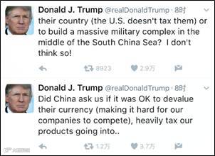 “电话门”事件后,特朗普又接连在Twitter上发文,“中国使其货币贬值(令咱们公司难以竞争),对咱出口到他们国家的商品征收重税”,以及“在南海中间修建巨型军事设施时,问过咱们O不OK了吗?我想没有吧!”