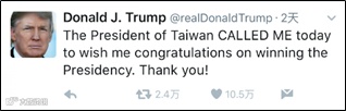与蔡英文通话后,特朗普先在Twitter上的发文强调是蔡英文“打给我”,而非他主动致电。