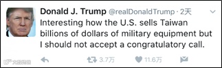 一小时后,特朗普再次发推为自己的行为辩解:“美国向台湾出售数十亿美元的武器装备,但我却不应该接一通祝贺电话,呵呵”。
