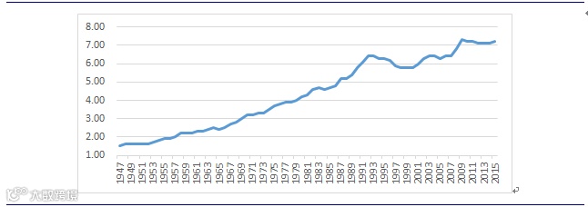 纵向回顾美国卫生及社保业(Health Care and Social Assistance)占GDP比重变化我们发现自1947年至2015年该行业占美国GDP比重增长了3.8倍,这意味着卫生及社保业在美国实际GDP增长70.8倍的基础上还增长了3.8倍。在69年间美国数次大的经济周期中卫生及社保业占比稳步提升。