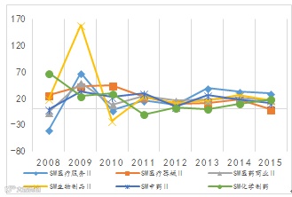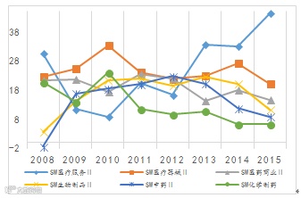 医疗服务和医药商业都属于大医药生物板块,2015年申万医药生物板块营收同比增长11.64%,在27个申万一级行业中排名第六。而在医药生物板块下的细分子行业中,医疗服务和医药商业都表现优异,营收增速和归母净利增速都分别在子版块中排名第一和第三。