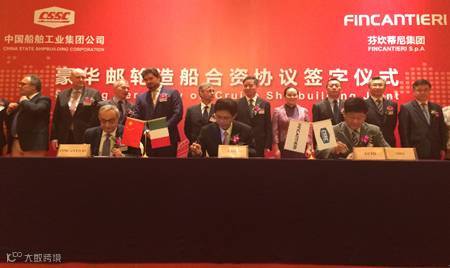 中国船舶工业集团公司(CSSC)与意大利芬坎蒂尼公司近期在上海正式签署豪华邮轮《造船合资公司协议》,工信部副部长辛国斌、上海市副市长赵雯、意大利驻华大使Ettore Sequi,意大利驻沪总领事Stefano Beltrame,意大利芬坎蒂尼公司首席执行官Giuseppe Bono,中船集团公司总经理吴强等政府部门、金融机构、船舶行业及其他合作伙伴近100位嘉宾出席了签约仪式。