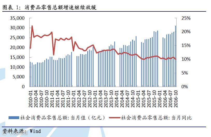 从分项数据来看,线上消费持续减速:2016年1-10月份,全国网上零售额39288亿元(+25.7%),其中,实物商品网上零售额31740亿元(+24.9%),占社会消费品零售总额的比重为11.8%;在实物商品网上零售额中,吃、穿和用类商品分别增长28.8%、17.1%和27.8%。虽然网上零售额增速相对仍然较高,但增速与去年同期相比下滑明显,去年1-10月份网上商品零售额29484亿元(+34.6%),增速下滑的主要原因一方面是基数变大,另一方面是线上线下的融合红利消减,线上对线下的分流效应减弱。预计受“双11”影响,十一月线上消费数据会有小幅好转。