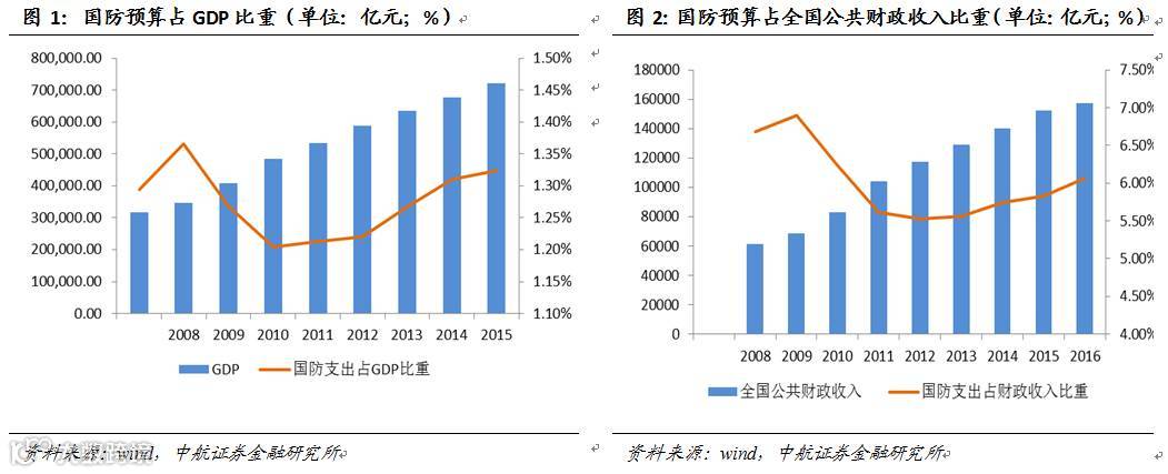 2016年预算草案中披露国防开支9543.54亿元,同比增长7.6%,为近6年来最低,显著低于市场预期。2011至2015年,我国国防预算均保持10%以上的增长,今年增幅回归个位数,究其原因,主要是目前经济下行压力较大,今年预算草案中GDP增速在6.5%-7%,财政收入增速3%,国防建设需要长期稳定的投入,军费预算与经济增速同步回落使其更具备持续性,有利于国防现代化建设的稳步发展。另外,如果从军费比重看,军费支出占GDP和财政收入的比重依旧呈现稳定增长的态势。