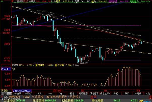 3周过去了,上证指数震荡上扬,而“上方的黄色压力线”已经渐渐下移,两个移动的目标渐行渐近,快到触碰的时刻,压力线的魔力爆发,今天不但创出了近期高点3062.36点,而且还出现了42点的中阴线,更加严重的是,指数创出新高,而揭示资金进出的增量度指标却未创出新高,这就是典型的“顶背离”的现象,这说明市场即将进入短期调整的周期。即便近期再次上冲,再创近期新高,短期看依然不应过于乐观。