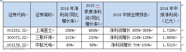 上证指数在下探到3373点后开始反弹,截止7月20日收于3992点,反弹力度18.4%。创业板从2304点开始触底回升,截止7月20日收于2848点,反弹力度23.6%。细心的投资者会发现,虽然指数开始了一波反弹行情,但个股的反弹力度却大有不同。有的股票已经收复失地创出新高,而有的股票还在不断探底。这里我们先来看看笔者观测到的几只强势股。上海莱士(002252)、三聚环保(300072)、中航光电(002179),这三只票中的上海莱士和三聚环保不光收复失地而且已经创出新高,而另外一只中航光电创出新高也指日可待。通过它们财务数据以及中报预告披露的信息,我们找到它们之所以强势的些许端倪。