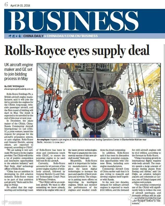 2017年5月,中国商用飞机有限责任公司(COMAC)与俄罗斯联合航空制造集团(UAC)的合资企业——中俄国际商用飞机有限责任公司(CRAIC)在上海成立。合资公司主要负责中俄联合研制新一代远程宽体飞机CR929项目的运行工作。2017年底,CRAIC向包括罗罗在内的多家发动机制造商发出CR929推进系统招标书。