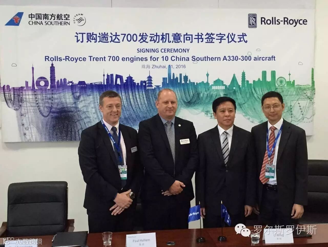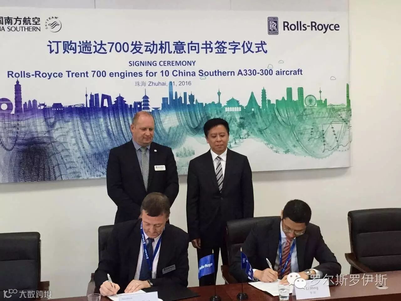 今天在珠海航展期间,中国南方航空公司机务工程部副总经理李明与罗尔斯·罗伊斯大中华区民航客户副总裁海波(Paul Hallam)代表双方签署协议。