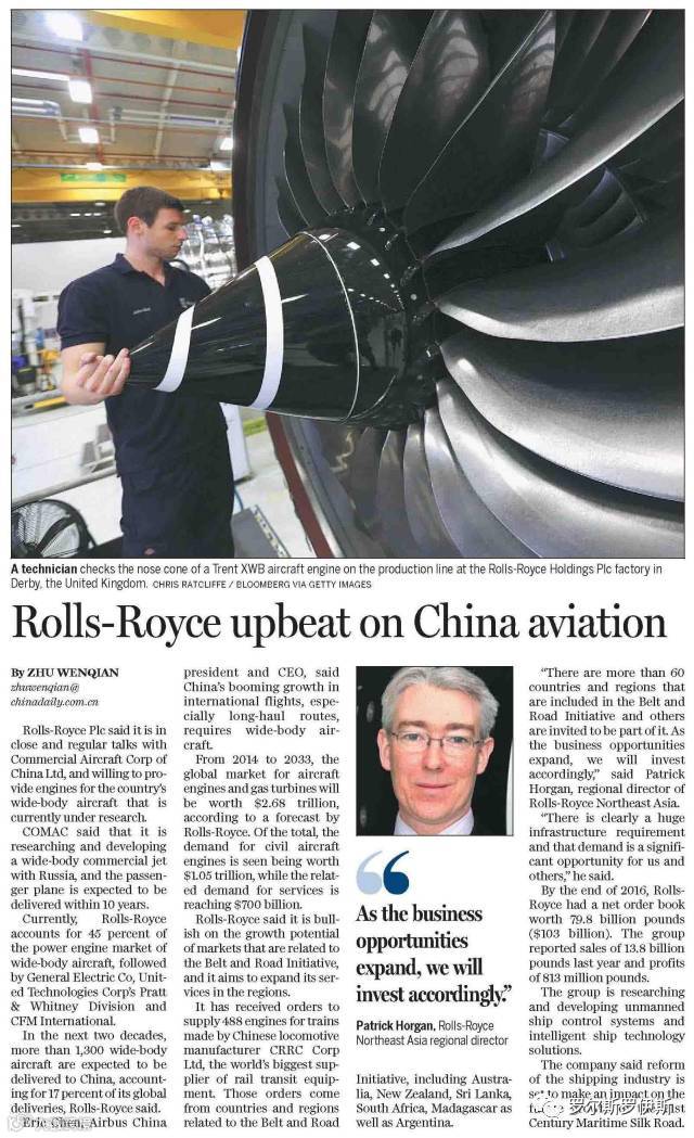 在各大媒体报道中,中国日报《罗罗看好中国航空》的专题格外引人注意,并被国内外多家媒体转载。文章指出,罗罗目前在全球宽体机用大型民航发动机市场占据领先地位,市场份额达45%。罗罗看好“一带一路”倡议给中国市场和工业发展带来的巨大机遇,将择机增加投资并为中国客户及沿线项目提供更多的相关服务。