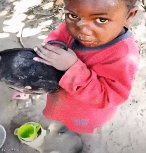 非洲,常常可以见到因为吃不饱饭而一遍遍舔锅底的孩子。
