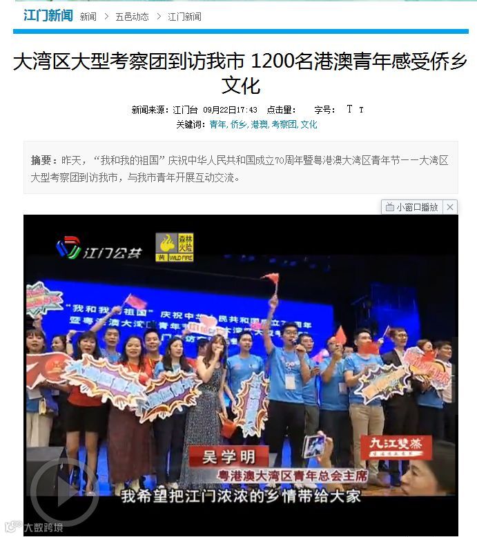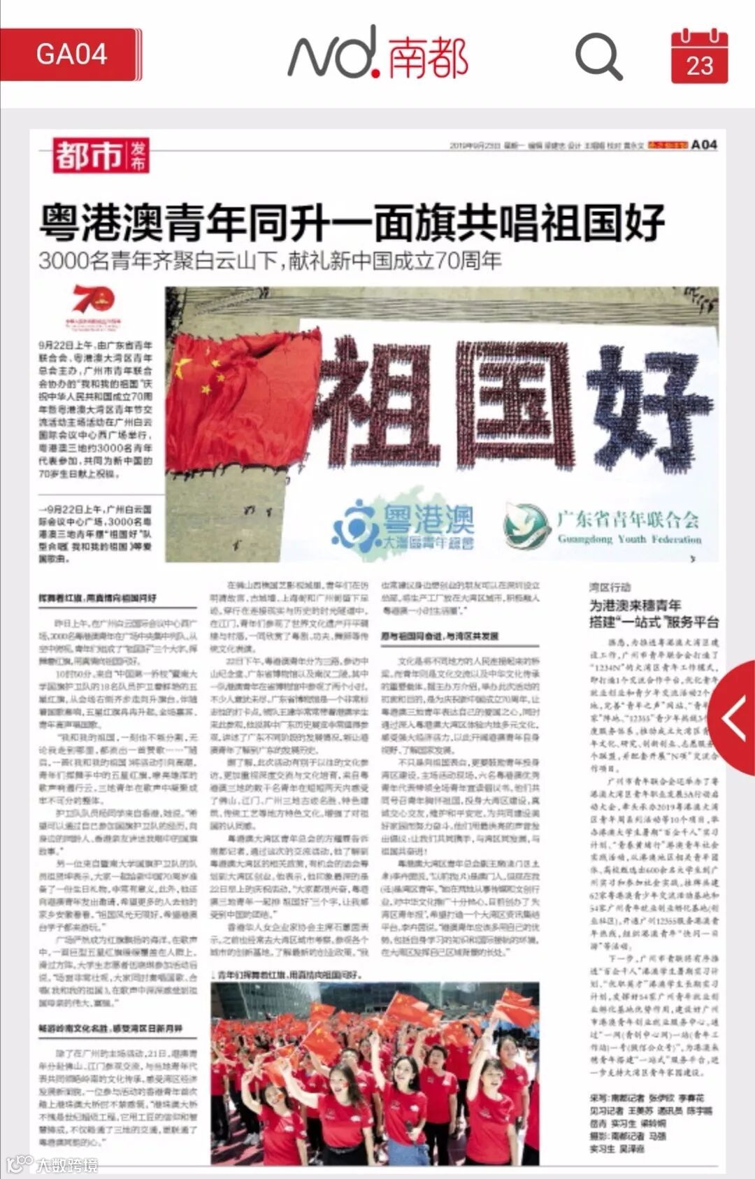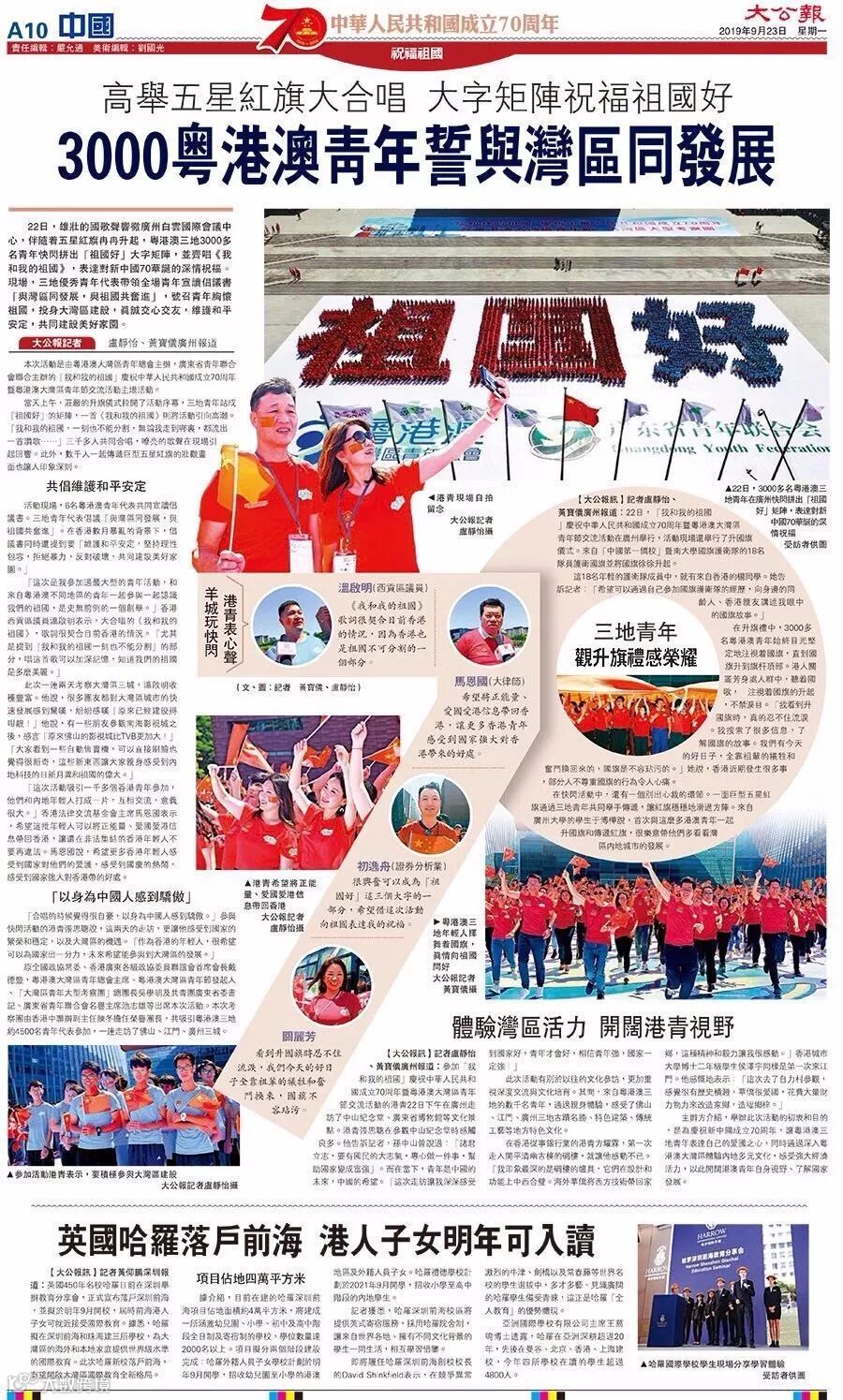 9月22日,粵港澳三地約三千名青年齊聚白雲山下,拼出“祖國好”三個字,表白祖國、迎接新中國成立70週年。活動圓滿舉行,引眾多媒體广泛報道、超3億人關注。此次考察團奔赴江門、佛山和廣州三地,愈4500名粵港澳青年參與其中。