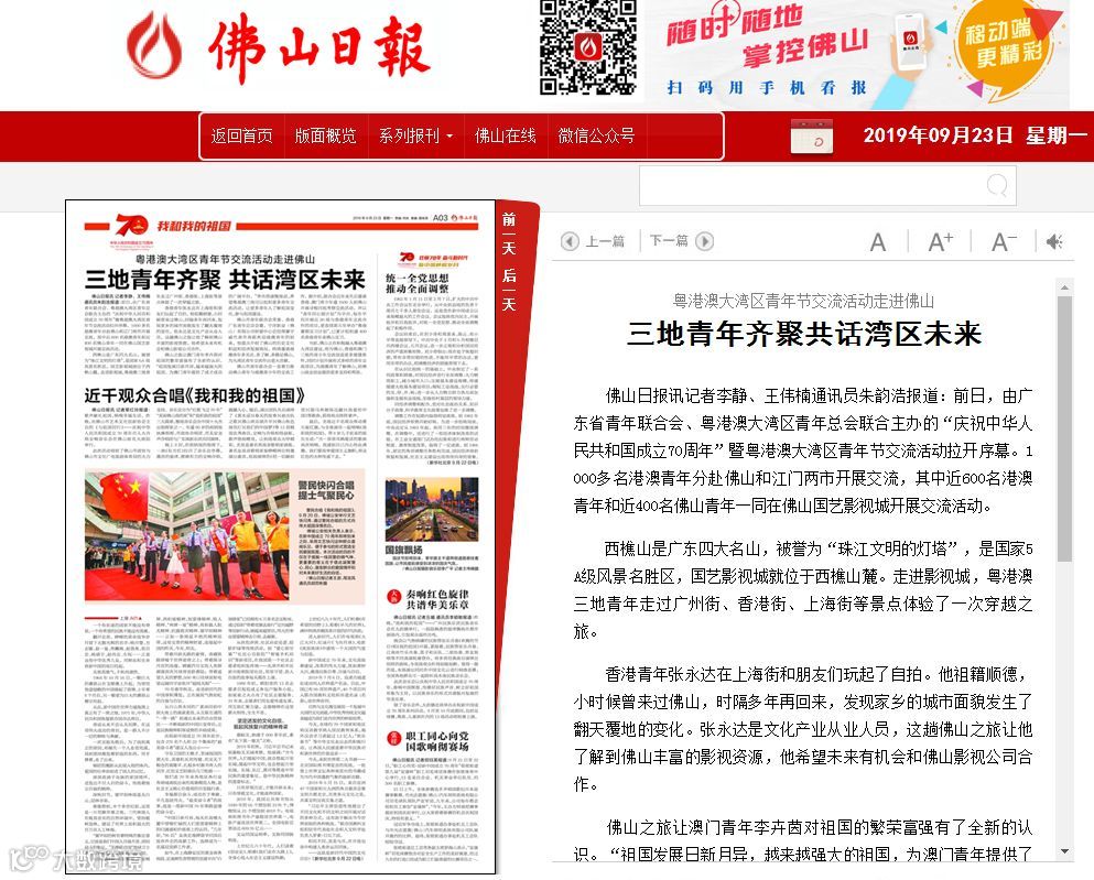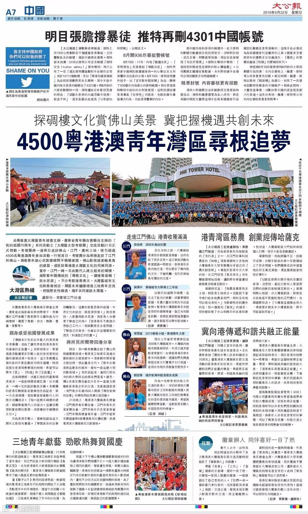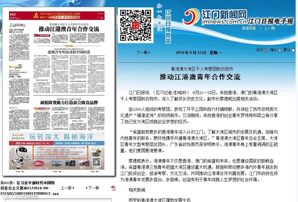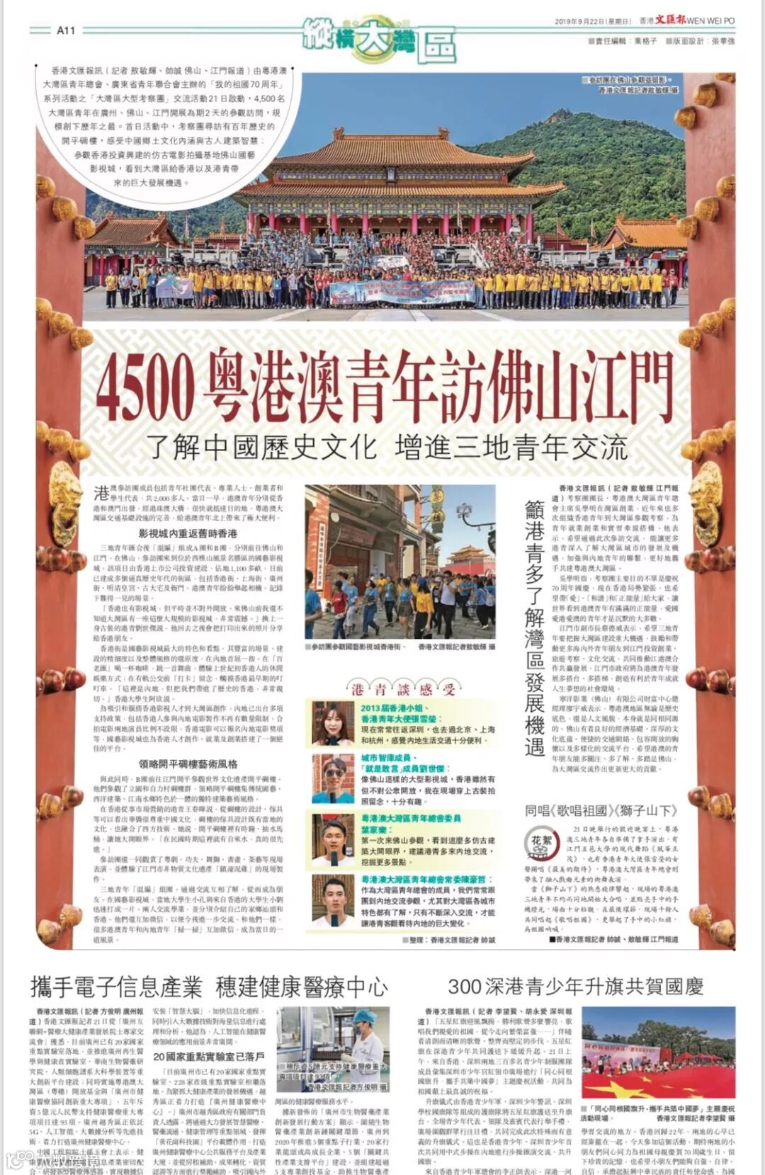 9月22日,粵港澳三地約三千名青年齊聚白雲山下,拼出“祖國好”三個字,表白祖國、迎接新中國成立70週年。活動圓滿舉行,引眾多媒體广泛報道、超3億人關注。此次考察團奔赴江門、佛山和廣州三地,愈4500名粵港澳青年參與其中。