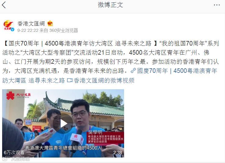 粵港澳大灣區青年總會主席、大灣區青年大型考察團總團長、廣東省政協委員吳學明表示,這次的大灣區青年考察團的一大特色是,青年朋友會根據他的興趣愛好和在大灣區的追求,大灣區青年總會會給予他們徽章,這些徽章便於他們自己辨識,志同道合的人,例如包括找工作,找創業機會,創業基金,還有找男女朋友或者是找一起找美食或旅遊的夥伴等。我們有專業人士免費收青年的簡歷、融資計劃書等。所以這個活動不是一次性的,是一個持續進行的項目。考察團主要的目的不單是慶祝70週年國慶,特別是現在香港局勢緊張的時候,我們希望帶“愛”“和諧”和“正能量”給大家,故而粵港澳大灣區青年總會組織這個有史以來最大的港澳青年考察團,就是讓世界看到港澳青年有滿滿的正能量,愛國愛港愛澳的青年才是沉默的大多數!在祖國70年誕辰即將到來的歷史性時刻,粵港澳大灣區青年總會代表全體大灣區青年,送出我們最嘹亮、最真誠的祝福!