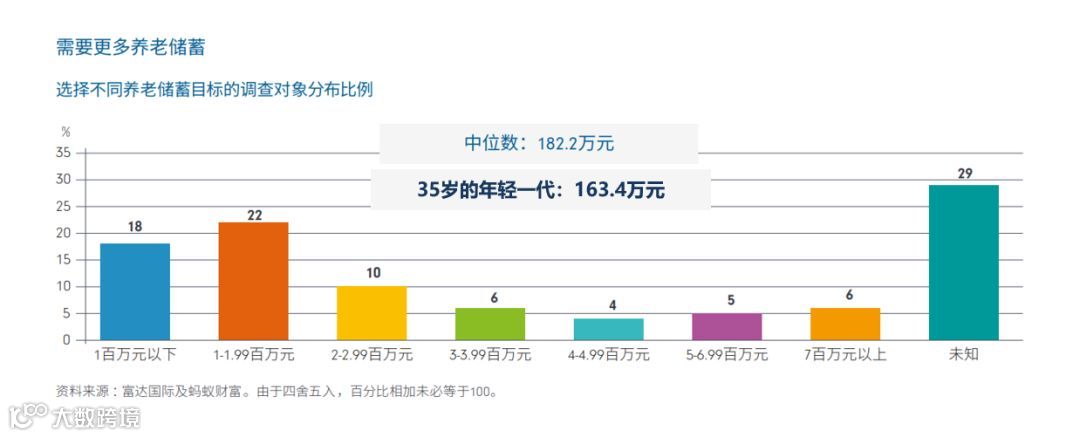 2018年,富达国际和蚂蚁财富曾联合发布了一份《中国养老前景调查报告》,介绍了他们通过调研分析得到的中国年轻一代对于养老储蓄的认知和他们当前的养老储备现状。调研报告显示,中国35岁以下的年轻人对他们的养老前景持乐观态度,调查对象中大部分人平均认为自己只要拥有163.4万人民币的养老现金储蓄就已经可以拥有一份舒适的老年生活。