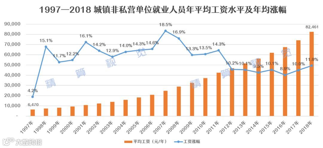 根据中国人社部公布的统计数据,我国城镇非私营单位就业人员的平均工资,已经从1997年时的6,470元/年(相当于月薪540元),上涨至2018年的82,461元/年(相当于月薪6,900元),20年间翻了10倍还多,年复合增长率接近14%。