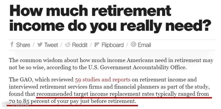 注:U.S. Government Accountability Office (GAO) ——美国审计总署。70%~85%替代率的得出,主要考虑了人们退休之后在缴税、社保、商业保险、养老储蓄方面的支出减少,以及人们在日常娱乐活动、外出旅游、医疗保健、疾病治疗和长期护理等方面的支出增加。