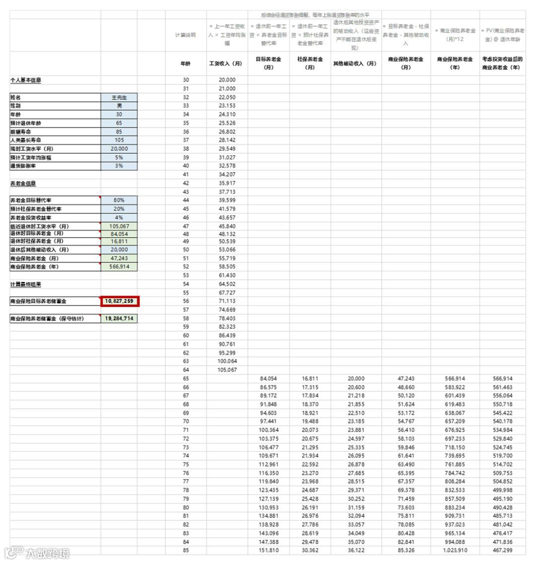 为此,我搭建了一个数学模型,输入数据:30岁男性,现时工资2万块,工资平均年涨幅5%,通货膨胀率3%,预计65岁退休,养老金目标替代率80%,社保能提供20%的替代率,活到85岁,退休后养老年金的投资收益率为年化4%,其他被动收入(如房屋出租等)每月2万块。