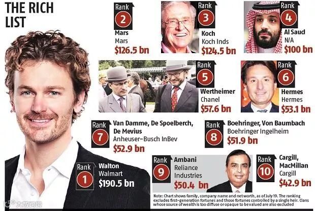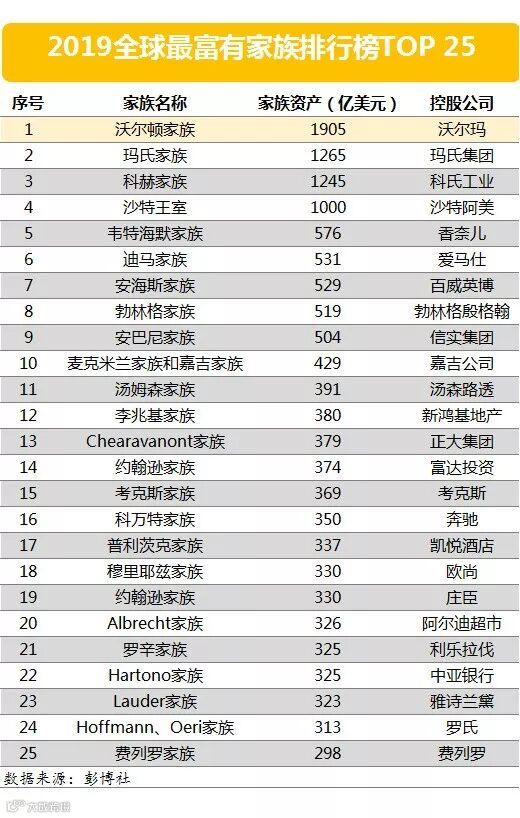 全球最大的金融信息服务供应商彭博社,发布了2019年全球最富有的25个家族名单。这25个old money家族,控制着超过1.4万亿美元的财富,比去年增加了2500万亿美元,上涨了24%!