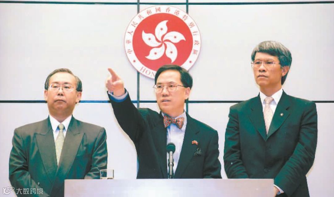 当天17点,香港财政司司长曾荫权召开新闻发布会。他的右手侧是财经事务局局长许仕仁,左手边是金管局局长任志刚。