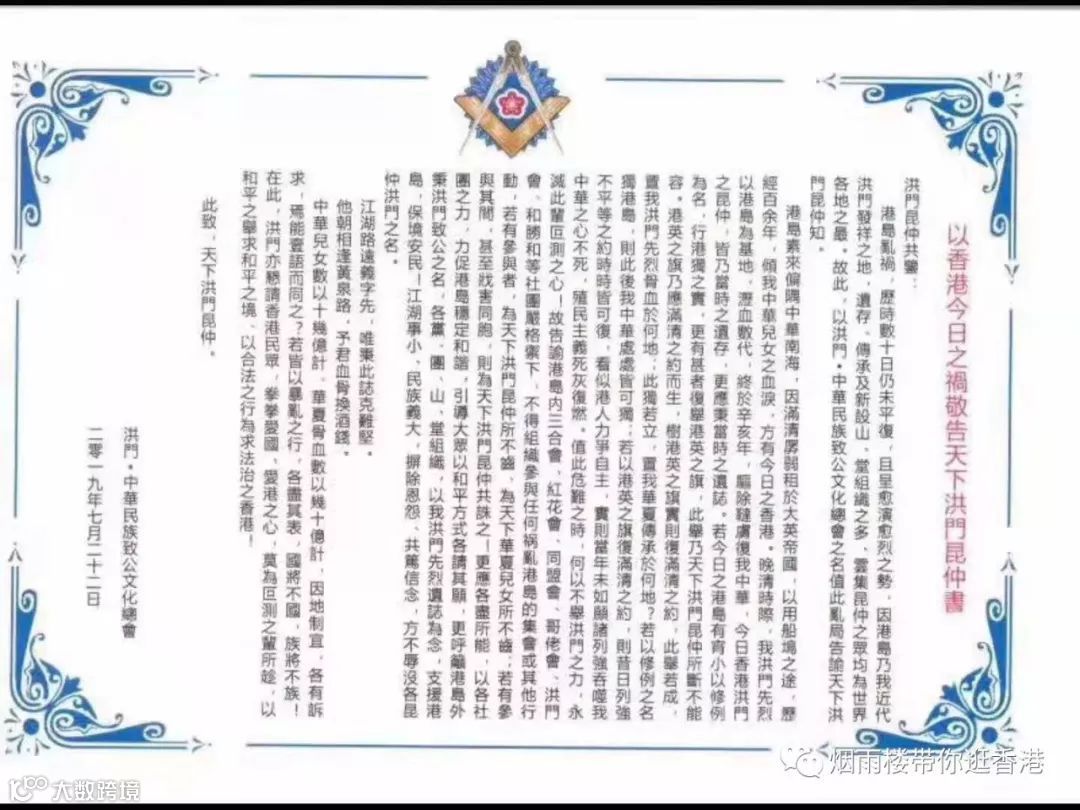 港岛素来偏隅中华南海,因满清孱弱租于大英帝国,以用船坞之途,历经百余年,倾我中华儿女之血泪,方有今日之香港。晚清时际,我洪门先烈以港岛为基地,沥血数代,终于辛亥年,驱除鞑虏复我中华,今日香港洪门之昆仲,皆乃当时之遗存,更应秉当时之遗志。若今日之港岛有宵小以修例为名,行港独之实,更有甚者,复举港英之旗,此举乃天下洪门昆仲所断不能容,港英之旗乃应满清之约而生,树港英之旗实则复满清之约,此举若成,置我洪门先烈骨血于何地,此独若立,置我华夏传承于何地?若以修例知名独港岛,则此后我中华处处皆可独,若以港英之旗复满清之约,则昔日列强不平等条约皆可复,看似港人之力争自主,实则当年未如愿诸列强吞噬我中华之心不死,殖民主义死灰复燃,值此为难之时,何以不举洪门之力,永灭此辈叵测之心,故告谕港岛内之三合会、红花会、同盟会、哥佬会、洪门会、和胜和等社团严格御下,不得组织参与任何祸乱港岛的集会或其他行动,若有参与者,为天下洪门昆仲所不齿,为天下华夏儿女所不齿,如有参与其间,甚至残害同胞,则为天下洪门所共诛之!更应各尽所能,以各社团之力,力促港岛稳定和谐,引导大众以和平方式各请其愿,更呼吁港岛外秉洪门致公之名,各党、团、山、堂组织,以我洪门先烈遗志为念,支援港岛,保境安民!江湖事小,民族义大,摒除恩怨、共笃信念,方不辱没各昆仲洪门之名。