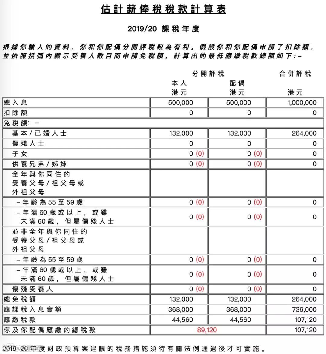 年薪100万港币家庭在不申请任何免税额情况下的个人所得税表