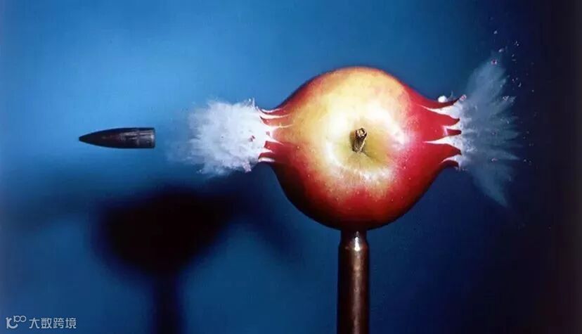 麻省理工学院的电子工程教授哈罗德·金顿(Harold Eugene “Doc” Edgerton)早在1964年的时候,就利用每秒100万帧的高速相机拍摄了子弹打穿一个苹果的照片。