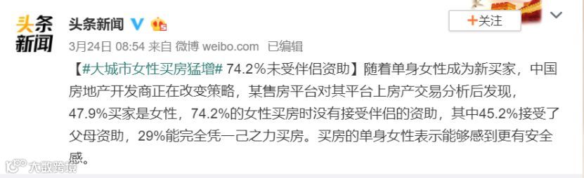 在微博上看到一则新闻,说是某售房平台分析后发现,47.9%的买家是女性,其中,74.2%的女性买房时没有接受伴侣的资助,29%能完全凭一己之力买房。