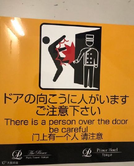 ドアの向こうに人がいます、ご注意ください。(请注意门的另一侧是否有人)——门上有一个人,请注意。