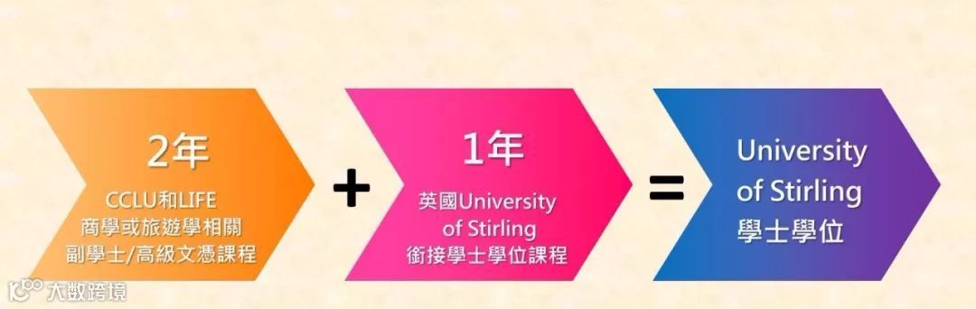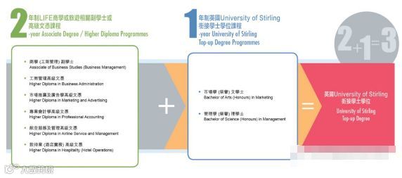 3年获取英国大学学位,成功入读LIFE商学或旅遊相关两年制副学士或高级文凭课程可获英国University of Stirling「有条件取录」,毕业后即可升读至其与LIFE合办的一年衔接制学士学位课程,包括管理学(荣誉)理学士和市场学(荣誉)文学士。
