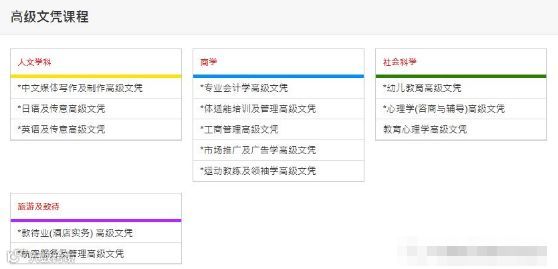 高级文凭课程包括:人文学科类、商学类、社会科学类和旅游及款待类。