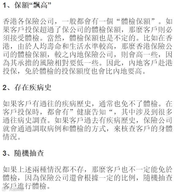 投保體檢不過關,要麼面臨著保費的增加,要麼就直接被拒保,想要一份保障也做不到。但是,並不是每個想要投保的客戶都會被要求體檢,那麼,香港保險公司在體檢這方面,是怎樣的呢?