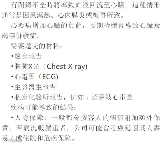 •人壽保障:若病況輕微,沒有出血紀錄及已康復超過一年,無併發症,公司可考慮以標準保費率接納申請。對於在最近一年內發病,病況較嚴重及有多次出血紀錄的客人,人壽保障會附加額外保費。