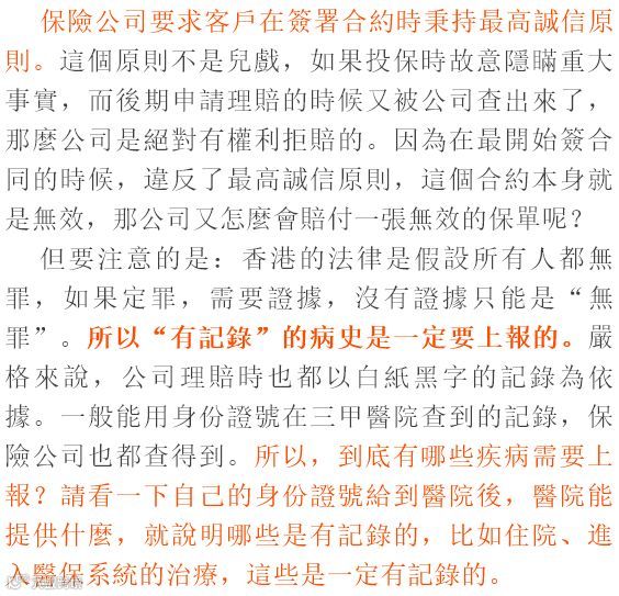 香港保險遵循“最高誠信原則”,投保時需要向保險公司如實告知受保人的身體健康狀況以及疾病史,如實告知的形式是填寫保單申請書中的健康問卷。
