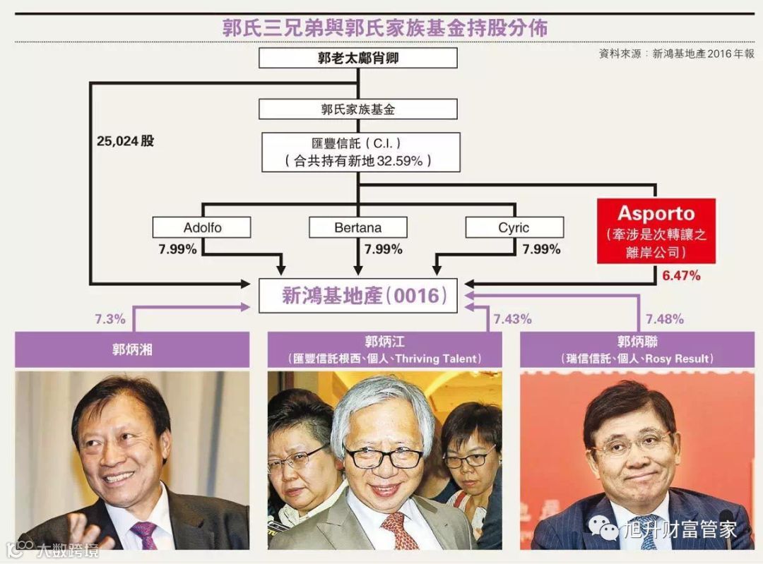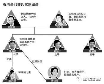 郭氏家族全权信托的受托人是汇丰信托,由父亲郭德胜成立,1990年10月30日,郭德胜逝世,生前成立的家族信托基金,指明新鸿基主席必须由郭姓家族成员出任,妻子邝肖卿占比最大,遗产分配也由她掌管,同时规定受益人不准变卖股份。