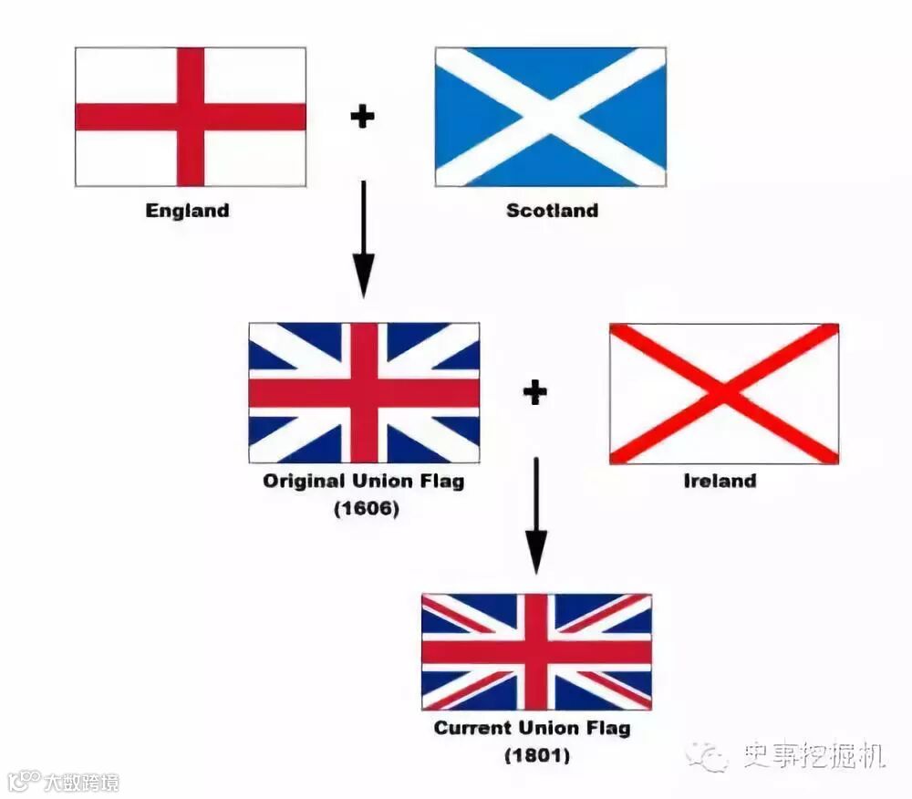 英国国旗:旗中带白边的红色正十字代表英格兰守护神圣·乔治,白色交叉十字代表苏格兰守护神圣·安德鲁,红色交叉十字代表爱尔兰守护神圣·帕特里克。
